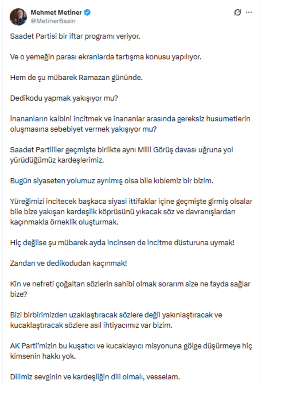 AK Partili Mehmet Metiner’in mesajı şöyle: