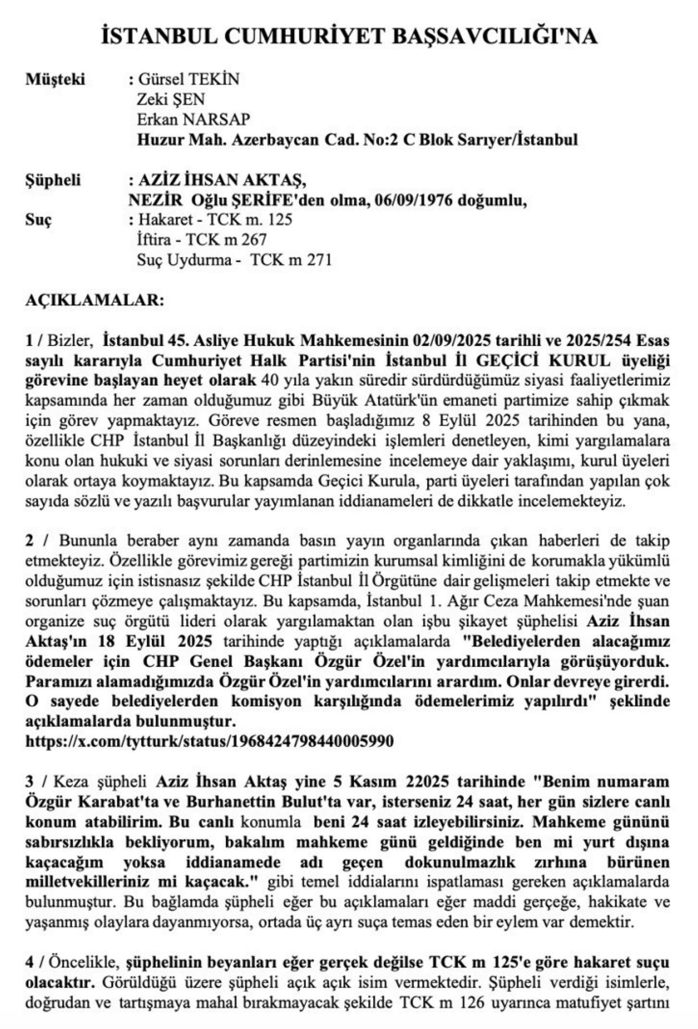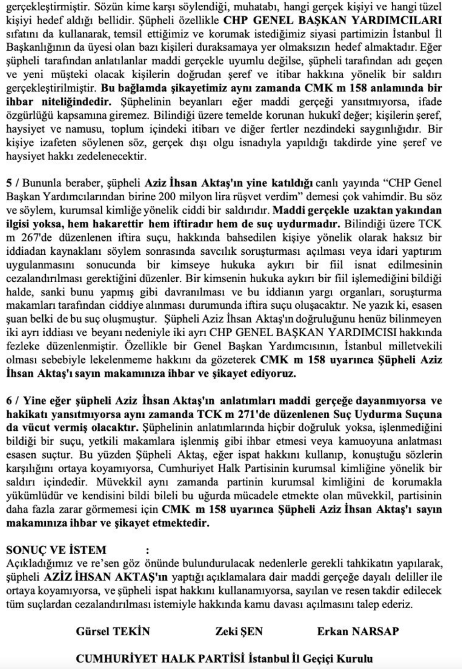 Dilekçede ayrıca Aziz İhsan Aktaş’ın, bir televizyon programında “CHP Genel Başkan Yardımcılarından birine 200 milyon lira rüşvet verdim” iddiasının, parti kurumsal kimliğine yönelik ağır bir saldırı niteliğinde olduğu ifade edildi. Kurul, söz konusu iddiaların doğruluğunun kanıtlanamaması halinde bunun Türk Ceza Kanunu uyarınca “iftira” ve “suç uydurma” suçunu oluşturduğunu hatırlattı.