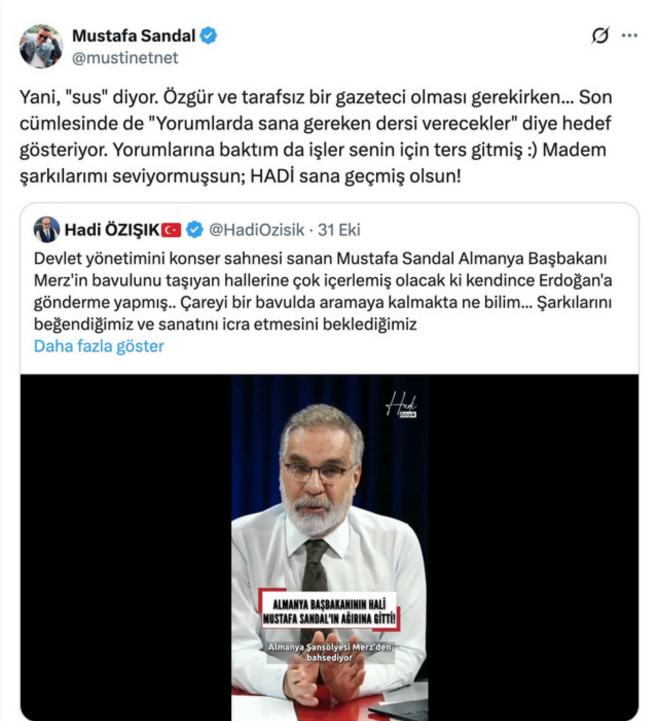 Mustafa Sandal, Cumhurbaşkanı ve AK Parti Genel Başkanı Recep Tayyip Erdoğan’ın “İtibardan tasarruf olmaz” söylemine atıfla Merz için “İtibardan bu kadar tasarruf da biraz abartı olmuş!” mesajını paylaşmıştı.
