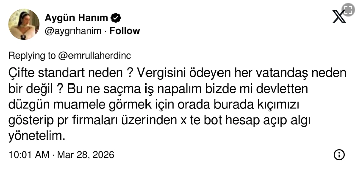 Aygün Aydın, Hande Erçel’in soruşturma sürecine ilişkin gelişmelerin ardından sosyal medyada sert bir çıkış yaptı. Aydın, uygulamalarda çifte standart olduğunu öne sürerek, “Vergisini ödeyen her vatandaş neden eşit değil?” sözleriyle tepki gösterdi.