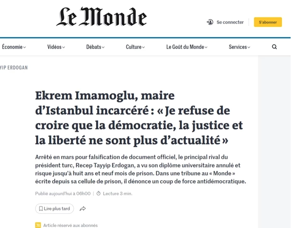 CHP’nin cumhurbaşkanı adayı ve İstanbul Büyükşehir Belediye Başkanı Ekrem İmamoğlu, Fransız gazetesi Le Monde’da yayımlanan yazısında, hakkında açılan “Kafkavari” davaları ve İstanbul Üniversitesi tarafından 30 yıl sonra iptal edilen diplomasına dair görüşlerini paylaştı. 23 Mart’tan bu yana tutuklu bulunan İmamoğlu, Kafka’nın Dava adlı eserine atıfta bulunarak, “100 yıl sonra, dünya yeniden demokrasi, adalet, özgürlük ve temel insan haklarının geçersiz olduğunu bize kabul ettirmeye çalıştıkları bir döneme giriyor. Buna inanmayı reddediyorum” ifadelerini kullandı.