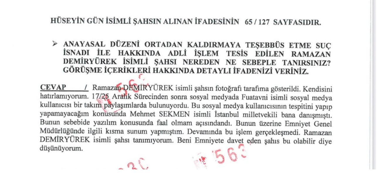 “17-25 Aralık sürecinden sonra sosyal medyada ‘Fuat Avni’ isimli sosyal medya kullanıcısı birtakım paylaşımlarda bulunuyordu. Bu sosyal medya kullanıcısının tespitini yapıp yapmayacağım konusunda Mehmet Sekmen isimli İstanbul Milletvekili bana danışmıştı. Bunun sebebi de yazılım konusunda faal olmamdı. Bunun üzerine Emniyet Genel Müdürlüğü’nde ilgili kısma sunum yapmıştım. Devamında bu işlem (Fuat Avni’nin tespiti) gerçekleşmedi. Beni Emniyet’e davet eden şahıs bu (Mehmet Sekmen) olabilir diye düşünüyorum.”