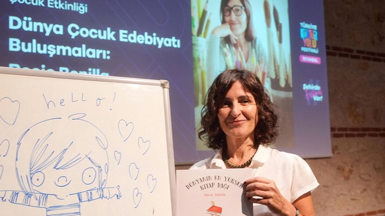Rocio Bonilla, bugüne kadar 56 kitaba imza attığını, çizmek ve resmetmenin birbirine benzeseler de aslında farklı şeyler olduğunu sözlerine ekledi.