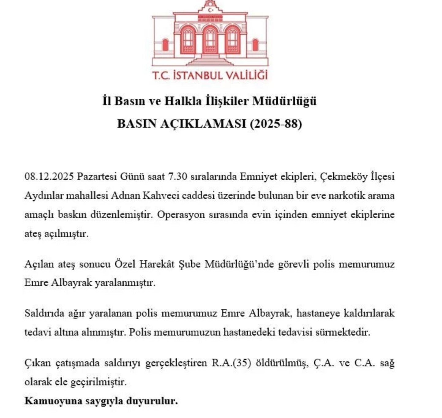 Olay, 8 Aralık 2025 Pazartesi Günü, saat 07.30 sıralarında İstanbul Çekmeköy İlçesi Aydınlar Mahallesi Adnan Kahveci Caddesi üzerinde meydana geldi. Emniyet ekipleri, narkotik arama amacıyla belirlenen bir eve baskın düzenledi. Operasyon sırasında, evin içinden emniyet ekiplerine doğru ateş açıldı.