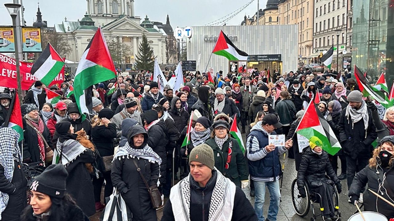 "Sivilleri bombalamak meşru müdafaa değil. Soykırıma hayır de", "Kurtuluşa erişene kadar direniş", "Filistin için ayağa kalkın", "Gıda kısıtlamasına son verilsin" ve "İsrail barış anlaşmasına uysun" yazılı dövizler taşıyan göstericiler, İsveç hükümetini İsrail'e karşı kapsamlı askeri ambargo uygulamaya davet etti.