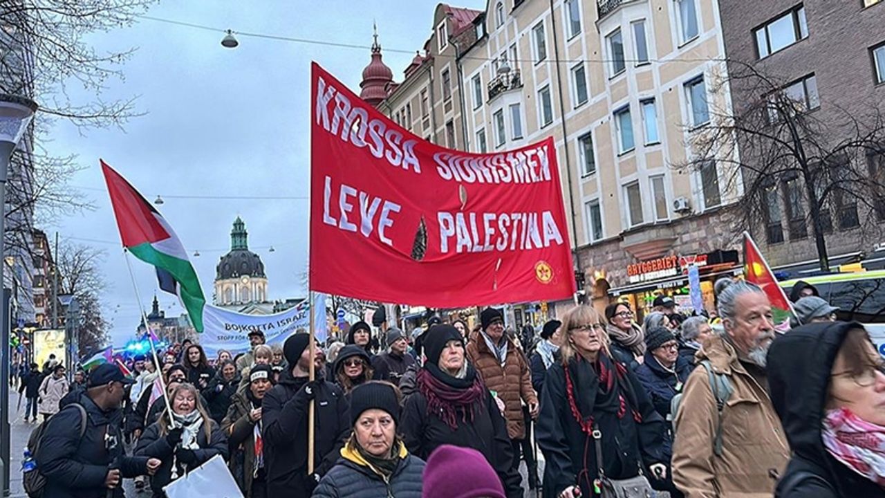 "Sivilleri bombalamak meşru müdafaa değil. Soykırıma hayır de", "Kurtuluşa erişene kadar direniş", "Filistin için ayağa kalkın", "Gıda kısıtlamasına son verilsin" ve "İsrail barış anlaşmasına uysun" yazılı dövizler taşıyan göstericiler, İsveç hükümetini İsrail'e karşı kapsamlı askeri ambargo uygulamaya davet etti.