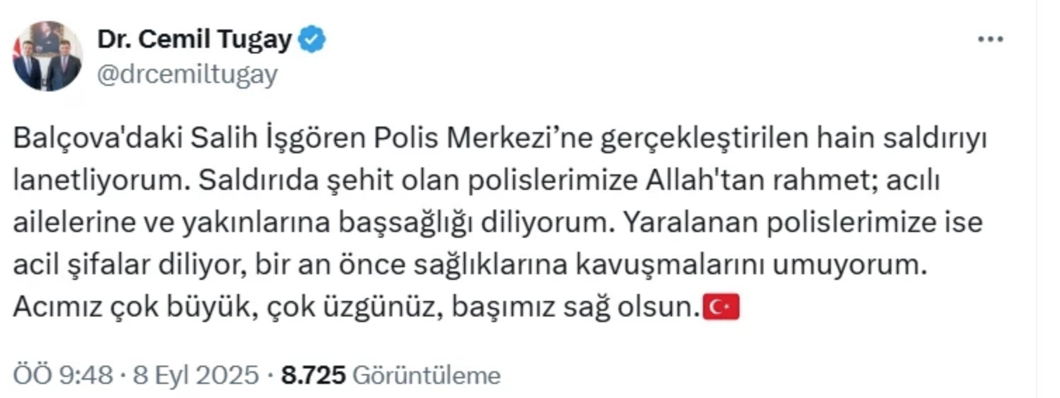 Balçova ilçesinde bulunan Salih İşgören Polis Merkezi’ne yönelik bu sabah bir saldırı düzenlendi. 16 yaşında bir çocuk tarafından pompalı tüfekle yapıldığı belirtilen saldırıda, 2 polis memuru şehit oldu, 1 polis ağır yaralandı. Olay yerinde incelemeler sürüyor.