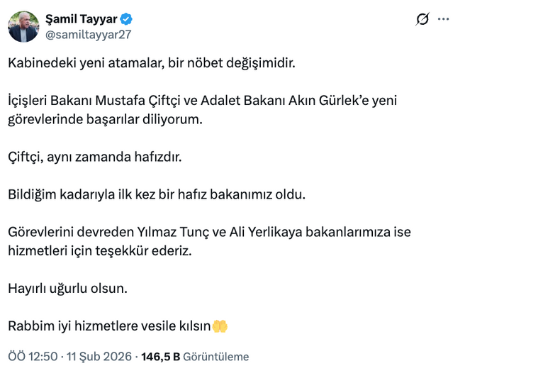 AK Partili Şamil Tayyar ise kabine değişimi ardından paylaştığı mesajında, ilk kez bir hafıza bakan olduğunu söyleyerek şunları yazdı: