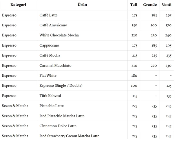 Yeni fiyatlara göre Starbucks'ta Americano'nun fiyatı 120 TL'den 150 TL'ye yükseldi. Filtre kahve ise 115 TL'den 145 TL'ye çıktı. Böylece her iki ürüne gelen zam oranı yüzde 25 ila 30 arasında oldu.