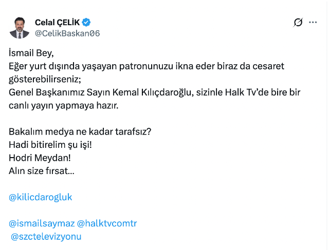 Çelik, “İsmail Bey, Eğer yurt dışında yaşayan patronunuzu ikna eder biraz da cesaret gösterebilirseniz; Genel Başkanımız Sayın Kemal Kılıçdaroğlu, sizinle Halk Tv’de bire bir canlı yayın yapmaya hazır. Bakalım medya ne kadar tarafsız? Hadi bitirelim şu işi! Hodri Meydan! Alın size fırsat” ifadelerini kullandı.
