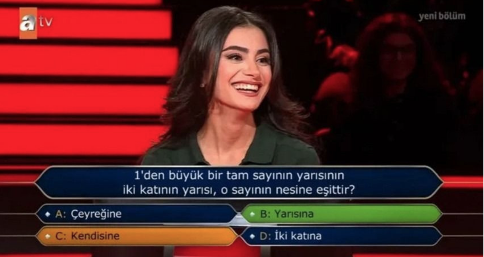 Yarışmaya katılan Nazlı Arslan isimli yarışmacı, ilk baraj sorularını kolaylıkla geçtikten sonra yarışmanın 4'üncü sorusunda "1'den büyük bir tam sayının yarısının iki katının yarısı, o sayının nesine eşittir?" sorusuyla karşılaştı.Bir şirkette insan kaynakları departmanında çalıştığını açıklayan yarışmacı sorunun doğru yanıtından emin olamayınca Seyirci Joker hakkını kullanmak istedi.