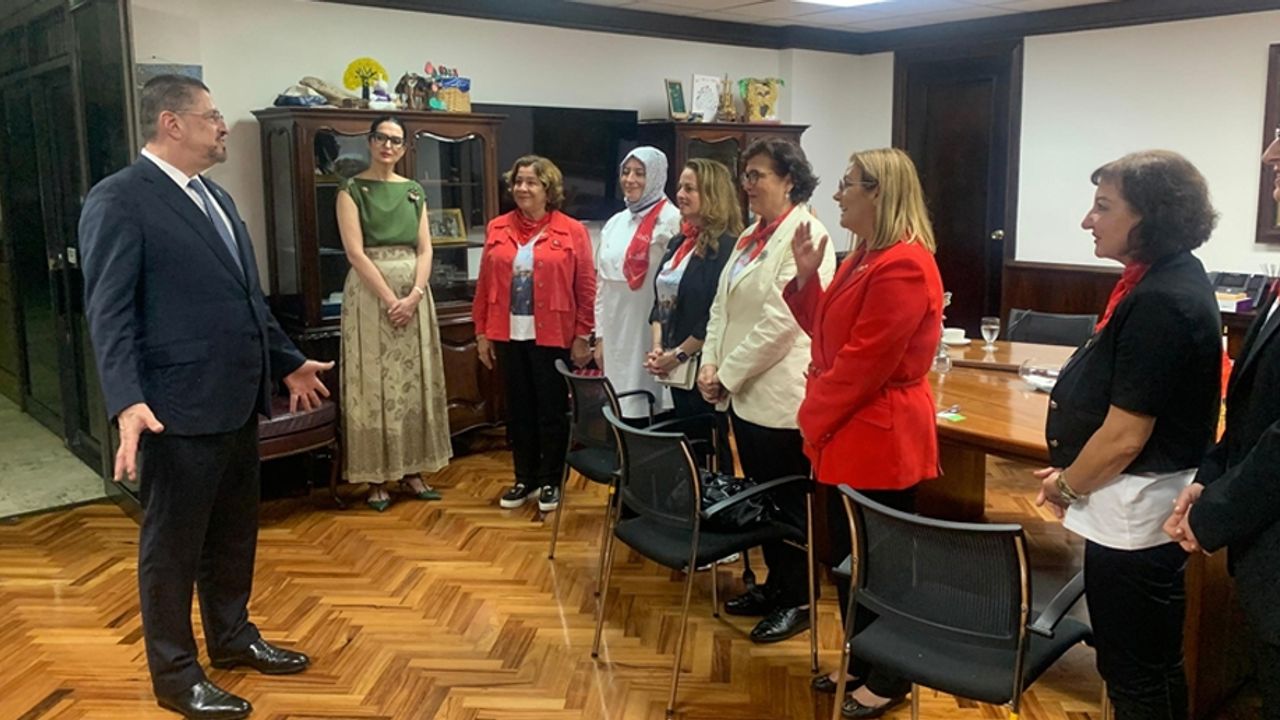 Türkiye'nin Kosta Rika Büyükelçisi Naciye Gökçen Kaya başkanlığındaki Ege İş Kadınları Derneği (EGİKAD) ve TOBB Kadın Girişimciler Kurulu üyeleri, başkent San Hose'deki Cumhurbaşkanlığı Sarayı'nda Kosta Rika lideri Chaves'in eşi Signe Zeikate tarafından kabul edildi.