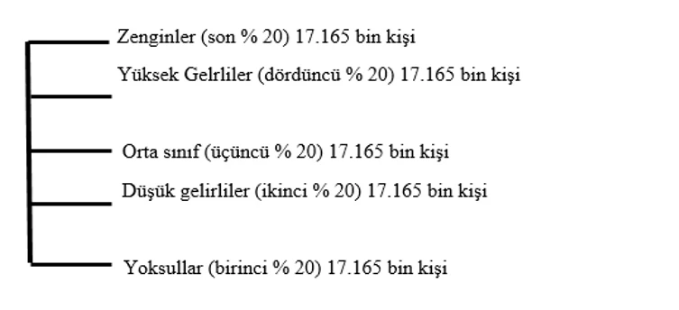 Türkiye’yi beş dişli bir tırmık gibi düşünelim. Her diş, nüfusun yüzde 20’sini temsil ediyor. En üstte zenginler var. Onların hemen altında yüksek gelirliler. Ortada, giderek incelen bir orta sınıf. Altında düşük gelirliler ve en dipte yoksullar. Buna göre yukarıdaki tabloyu bu tırmığa monte edelim: