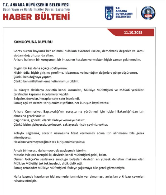 Ankara Büyükşehir Belediyesi'ne ilişkin konser soruşturması kapsamında ABB Başkanı Mansur Yavaş hakkında soruşturma izni talebi İçişleri Bakanlığı’na iletildi. Yavaş, kamuoyunun merakla beklediği açıklamasında, “Çağırırlarsa gönüllü olarak ifade vermeye hazırız. Gizleyecek, saklayacak hiçbir şeyimiz yok” ifadelerini kullandı.