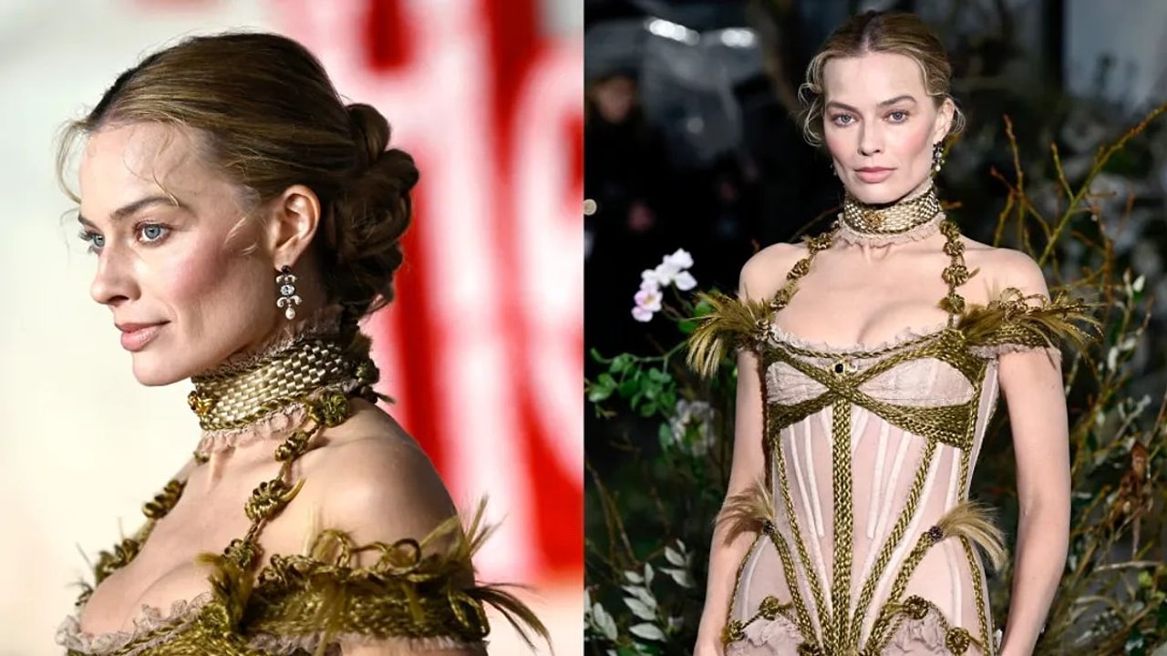 Londra’daki özel gösterimde objektiflerin yönü doğrudan Margot Robbie’ye döndü. Gotik dokuların hakim olduğu dramatik tasarım, klasik Hollywood şıklığından uzak, daha iddialı ve karakterli bir siluet ortaya koydu.