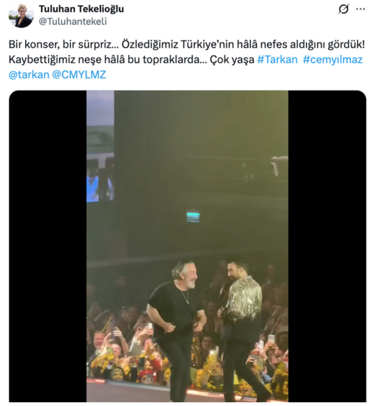 Tarkan’ın 7 yıl sonra İstanbul’da verdiği konser serisinin üçüncü gecesi, sürpriz bir konukla hafızalara kazındı. Ünlü komedyen Cem Yılmaz’ın sahneye çıkmasıyla coşku zirveye taşınırken, konserden paylaşılan görüntüler kısa sürede sosyal medyada gündem oldu. Hürriyet Genel Yayın Yönetmeni Ahmet Hakan da bugünkü köşe yazısında bu paylaşımlara değindi.