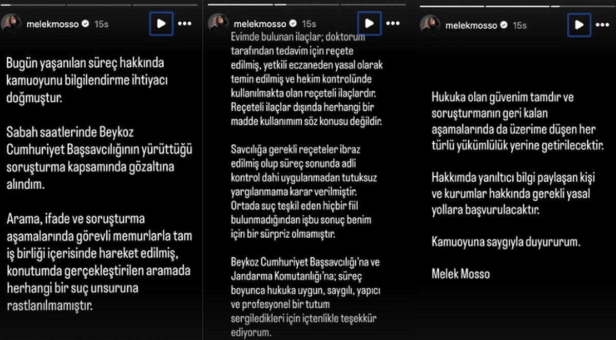 Melek Mosso, yaşanan süreçle ilgili yaptığı açıklamada şu ifadeleri kullandı: “Bugün yaşanılan süreç hakkında kamuoyunu bilgilendirme ihtiyacı doğmuştur. Sabah saatlerinde Beykoz Cumhuriyet Başsavcılığının yürüttüğü soruşturma kapsamında gözaltına alındım.