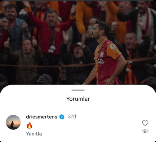 Galatasaray'la büyük başarılara imza atan Dries Mertens, geride bıraktığımız sezonda mukavelesinin bitmesinin ardından futbol kariyerini noktalamıştı. Fakat 38 yaşındaki unutulmaz futbolcu, eski takımını takibi sürdürüyor. Galatasaray'ın ve takımdaki isimlerin paylaşımlarına yorumlar yapıyor.