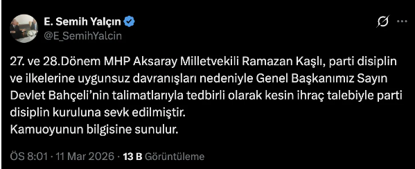 Kararı sosyal medya hesabından yaptığı paylaşımla duyuran MHP Genel Başkan Yardımcısı Semih Yalçın, sürecin detaylarını kamuoyuyla paylaştı. Kaşlı'nın parti tüzüğüne aykırı hareket ettiğini belirten Yalçın, "27. ve 28.Dönem MHP Aksaray Milletvekili Ramazan Kaşlı, parti disiplin ve ilkelerine uygunsuz davranışları nedeniyle Genel Başkanımız Sayın Devlet Bahçeli’nin talimatlarıyla tedbirli olarak kesin ihraç talebiyle parti disiplin kuruluna sevk edilmiştir" ifadelerini kullandı.