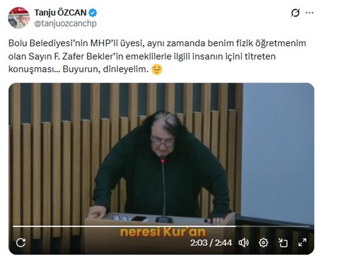 "Bolu Belediyesi’nin MHP’li üyesi, aynı zamanda benim fizik öğretmenim olan Sayın F. Zafer Bekler’in emeklilerle ilgili insanın içini titreten konuşması… Buyurun, dinleyelim"