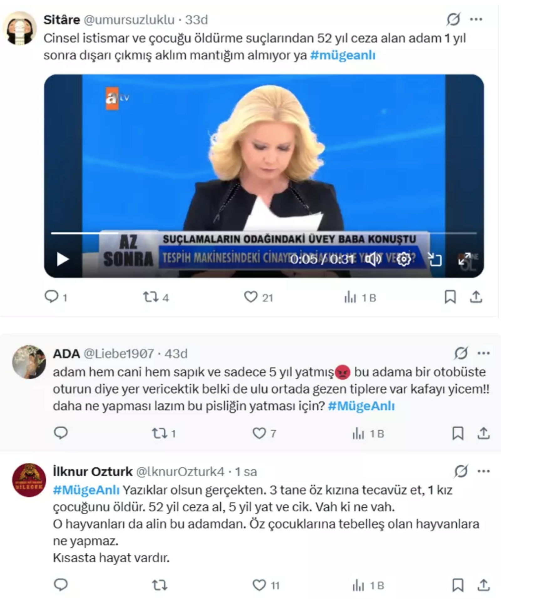 Müge Anlı, olayla ilgili olarak, “Biz işin içinden çıkamadık. Cinsel istismardan 22 yıl, çocuğu kasten öldürmekten 30 yıl ceza alıyor, Yargıtay bunu onaylıyor ama hâlâ dışarıda… Nasıl dışarıda? 52 yıl ceza almış ama nasıl serbest bırakılıyor? Çok enteresan bir durum” ifadelerini kullandı.