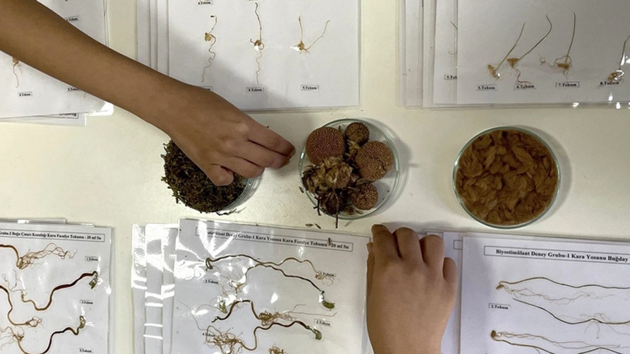 Osmangazi ilçesindeki BTSO Kamil Tolon Bilim ve Sanat Merkezi'nde eğitim gören 9. sınıf öğrencileri Damla Karaca, Fatıma Zehra Akıncı ve 8. sınıf öğrencisi Mine Çetinkaya'dan oluşan Biyoharmoni Takımı, iki yıldır üzerinde çalıştıkları "Yeni Biyostimülant Malzeme Olarak Kara Yosunu ve Doğu Çınarı Kozalağının Çimlendirme Destek Ünitelerinde Su Stresindeki Tohumlarda Değerlendirilmesi" adlı projeyle bitkinin gelişimini destekleyen gübre elde etti.