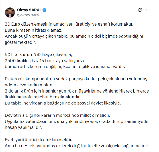 Cumhurbaşkanı Başdanışmanı Oktay Saral da 30 Euro gümrük muafiyeti ve gümrüksüz yurtdışı alışverişiyle ilgili düzenlemeye tepki gösterdi. Saral “Ne vicdanla bağdaşır ne de sosyal devlet ilkesiyle” dedi.