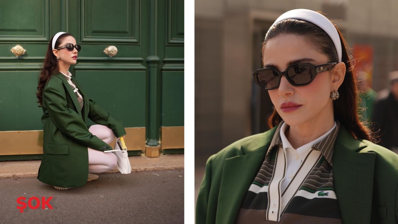 Özge Gürel, Lacoste Sonbahar/Kış 2026 defilesine yeşil-beyaz tonların öne çıktığı modern bir kombinle katıldı.