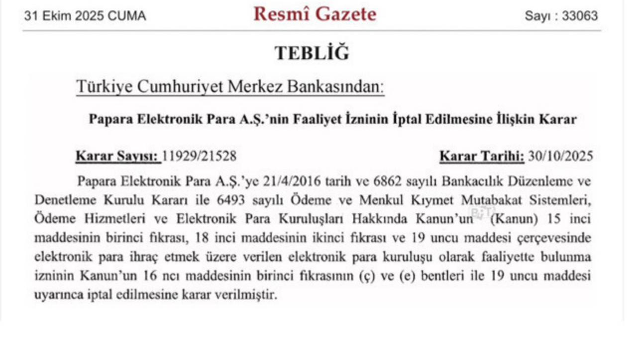 Türkiye Cumhuriyet Merkez Bankası (TCMB), Papara Elektronik Para A.Ş.’nin faaliyet iznini iptal etti.