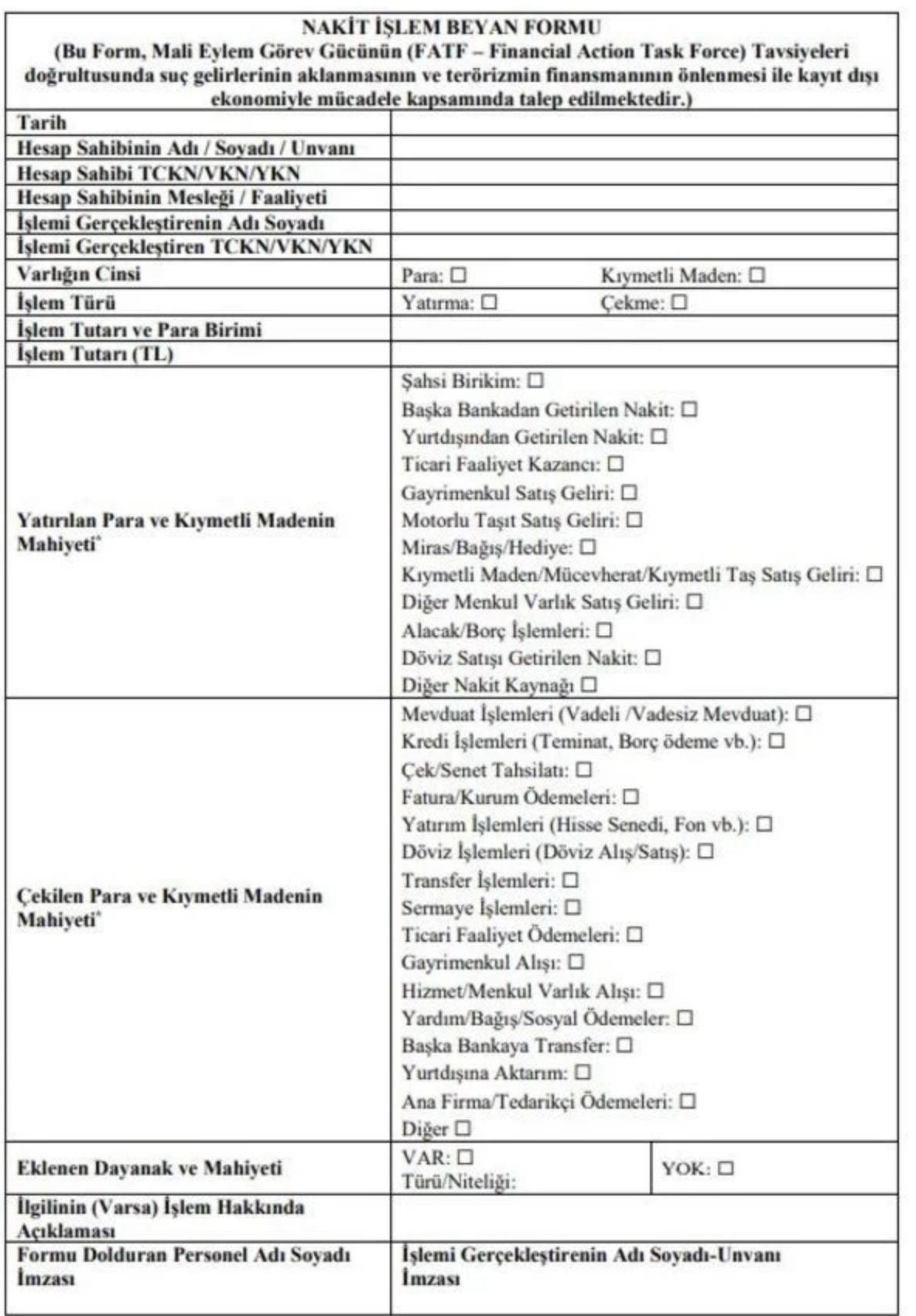 2 milyon TL ila 20 milyon TL arası nakit işlemlerde ise müşterinde Nakit İşlem Beyan Formu doldurması istenecek. Nakit İşlem Beyan Formunda işlemin mahiyetine ilişkin somut bilgi içermeyen, genel mahiyette “diğer” veya “bireysel ödeme” gibi başka seçeneklerin olması ve bunların müşteri tarafından seçilmesi durumunda, işlemin mahiyetine ilişkin olarak en az 20 karakter uzunluğunda işlem açıklaması temin edilecek.