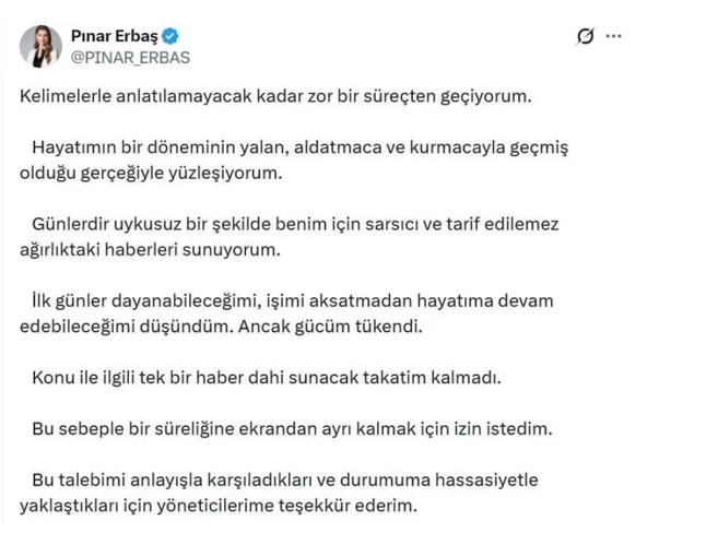 Yaşananların ardından günlerdir sessizliğini koruyan spiker Pınar Erbaş, sürece ilişkin bir açıklama yaparak yaşadığı psikolojik zorluğa dikkat çekti. Erbaş açıklamasında şu ifadelere yer verdi:
