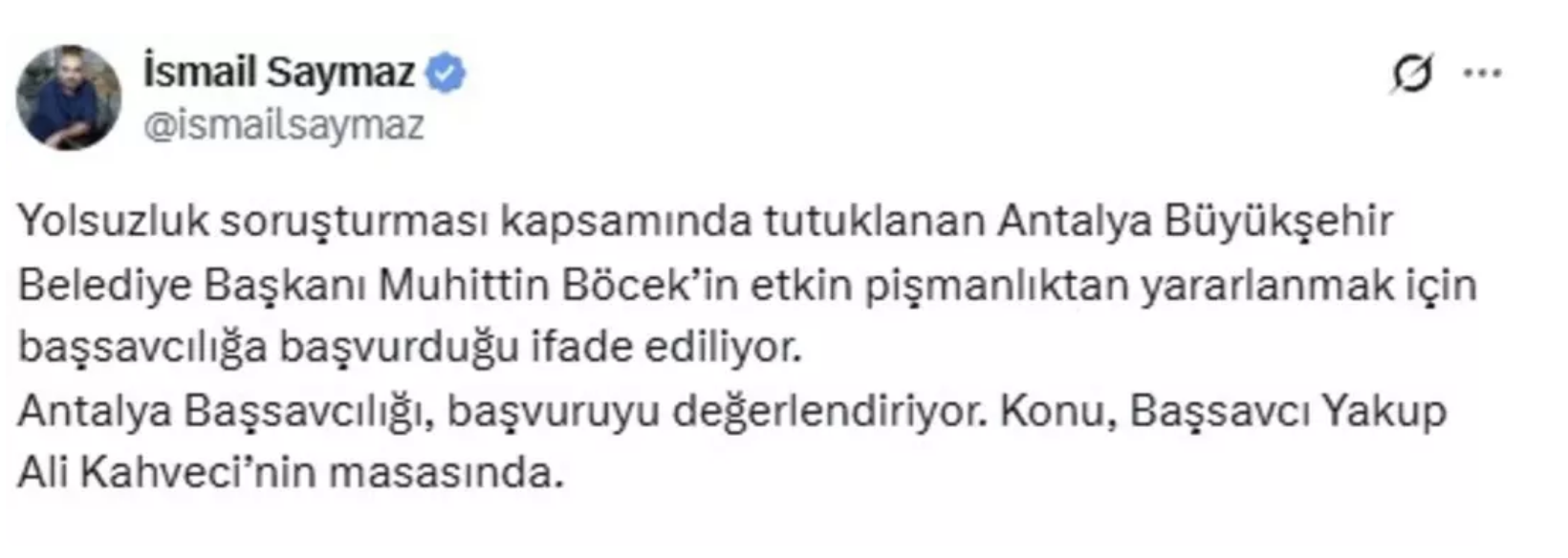 İlk açıklama İsmail Saymaz'dan geldi. Saymaz konuyla ilgili, "Yolsuzluk soruşturması kapsamında tutuklanan Antalya Büyükşehir Belediye Başkanı Muhittin Böcek’in etkin pişmanlıktan yararlanmak için başsavcılığa başvurduğu ifade ediliyor.