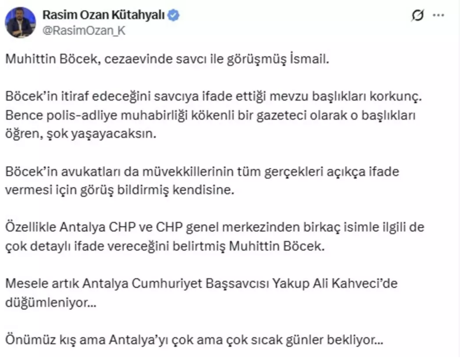 Özellikle Antalya CHP ve CHP genel merkezinden birkaç isimle ilgili de çok detaylı ifade vereceğini belirtmiş Muhittin Böcek.