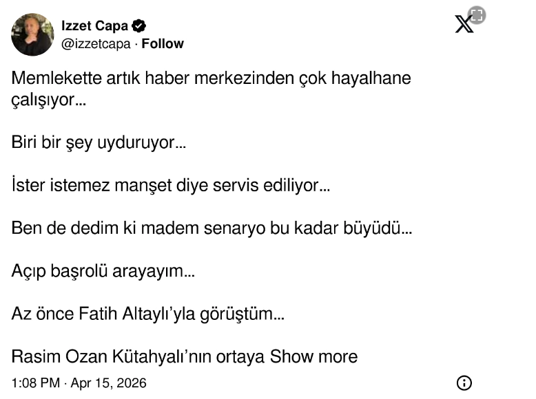 'Az önce Fatih Altaylı’yla görüştüm…' diyen İzzet Çapa'nın paylaşımı ise şu şekilde;