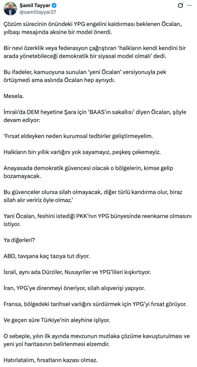 ŞAMİL TAYYAR, ÖCALAN'IN “YENİ YIL” MESAJINDAKİ İFADELERE TEPKİ GÖSTERDİ