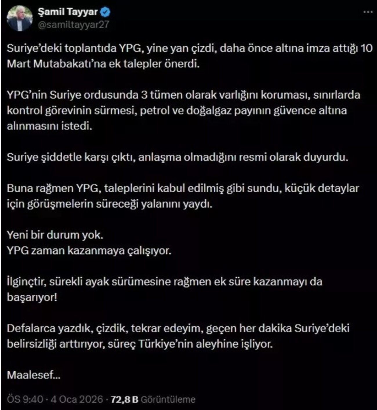 Tayyar, sosyal medya hesabından yaptığı paylaşımda şunları söyledi: "Suriye'deki toplantıda Ypg, yine yan çizdi, daha önce altına imza attığı 10 Mart Mutabakatı'na ek talepler önerdi. Ypg'nin Suriye ordusunda 3 tümen olarak varlığını koruması, sınırlarda kontrol görevinin sürmesi, petrol ve doğalgaz payının güvence altına alınmasını istedi.