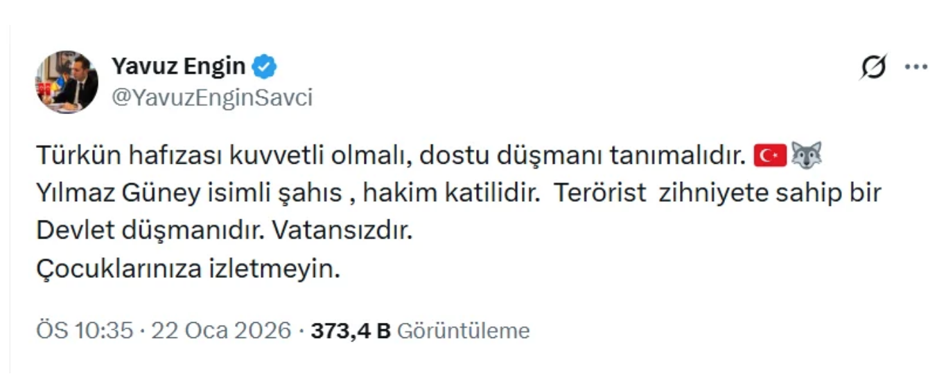 “Yenidoğan çetesi” soruşturmasıyla gündeme gelen Savcı Yavuz Engin sosyal medyadaki bu tartışmaya girerek X hesabından “Türkün hafızası kuvvetli olmalı, dostu düşmanı tanımalıdır. Yılmaz Güney isimli şahıs, hakim katilidir. Terörist zihniyete sahip bir Devlet düşmanıdır. Vatansızdır. Çocuklarınıza izletmeyin” mesajını paylaştı.