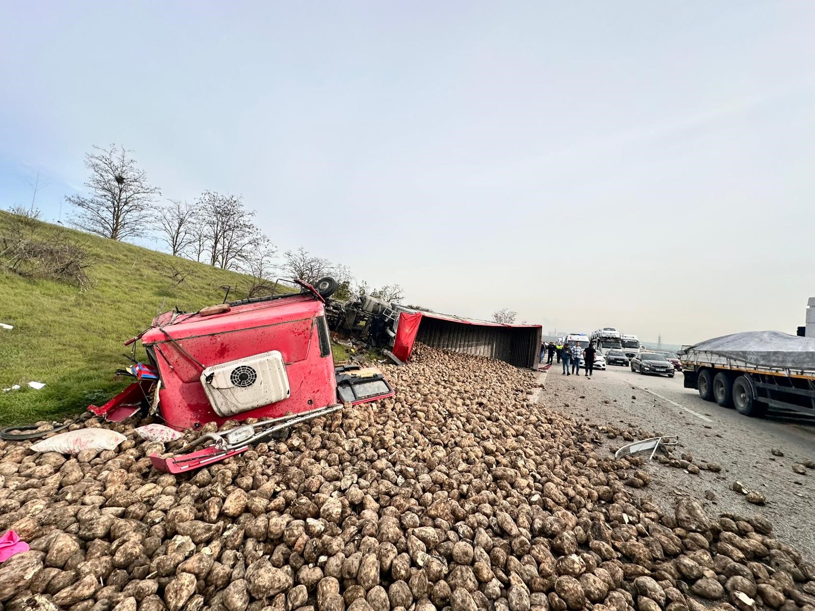 Kaza, saat 11.30 sıralarında İstanbul-İzmir Otobanı, Hal Kavşağı mevkiinde meydana geldi. Edinilen bilgiye göre, şeker pancarı yüklü tır, sürücüsünün kontrolünden çıkıp önce hafif ticari araca, sonra kamyonete çarptı. Savrulan araçlar refüje girerken, tır yola devrildi. Kazayı gören çevredekiler yaralıların yardımına koşarken, 112 ekiplerine bilgi verildi. İhbar üzerine olay yerine çok sayıda polis ve sağlık ekibi sevk edildi.