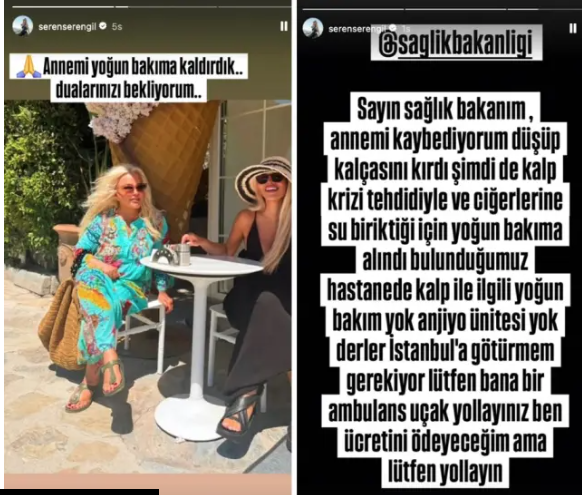 Seren Serengil, son paylaşımda; "Sayın Sağlık Bakanım, annemi kaybetme riskiyle karşı karşıyayım. Düşüp kalçasını kırdı, şimdi de kalp krizi tehdidiyle ve ciğerlerine su birikmesi nedeniyle yoğun bakıma alındı. Bulunduğumuz hastanede kalp ile ilgili yoğun bakım ve anjiyo ünitesi yok. İstanbul’a götürmem gerekiyor. Lütfen bana bir ambulans uçak gönderiniz; ücretini ödeyeceğim, ama lütfen yardım edin" ifadelerini kullandı.