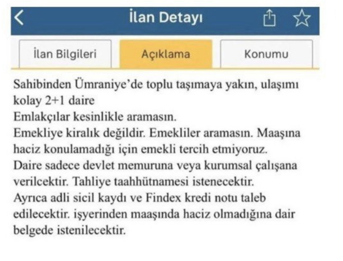 Sosyal medyada gündem olan ilanda "Emekliye kiralık değildir. Emekliler aramasın" ifadesi yer alırken, “Maaşına haciz konulamadığı için emekli tercih etmiyoruz. Daire sadece devlet memuruna veya kurumsal çalışana verilecektir. Tahliye taahhütnamesi istenecektir. Ayrıca adli sicil kaydı ve Findex kredi notu talep edilecektir. İşyerinden maaşında haciz olmadığına dair belge istenecektir” notu dikkat çekti.,