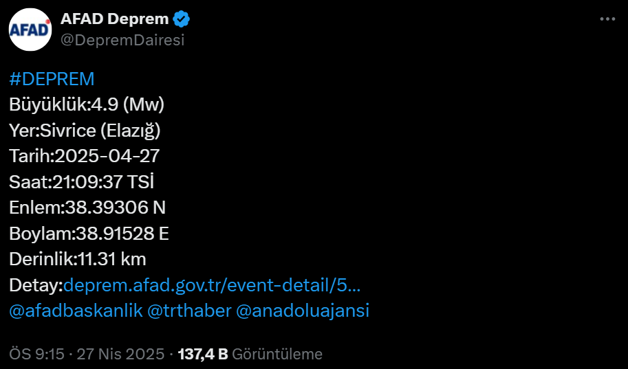 AFAD, meydana gelen depremin büyüklüğünü 4.9 olarak açıkladı. Depremin merkez üssü Elazığ'ın Sivrice ilçesi olarak belirtildi. Öte yandan deprem yerin 11 km altında gerçekleşti.