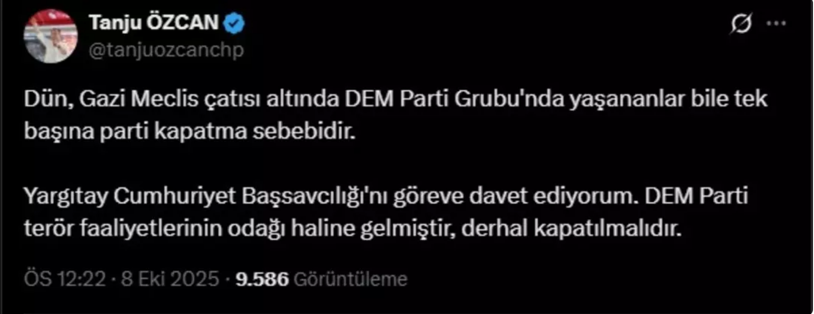 Özcan açıklamalarının devamında ise "Yargıtay Cumhuriyet Başsavcılığı'nı göreve davet ediyorum. DEM Parti terör faaliyetlerinin odağı haline gelmiştir, derhal kapatılmalıdır" ifadelerini kullandı.
