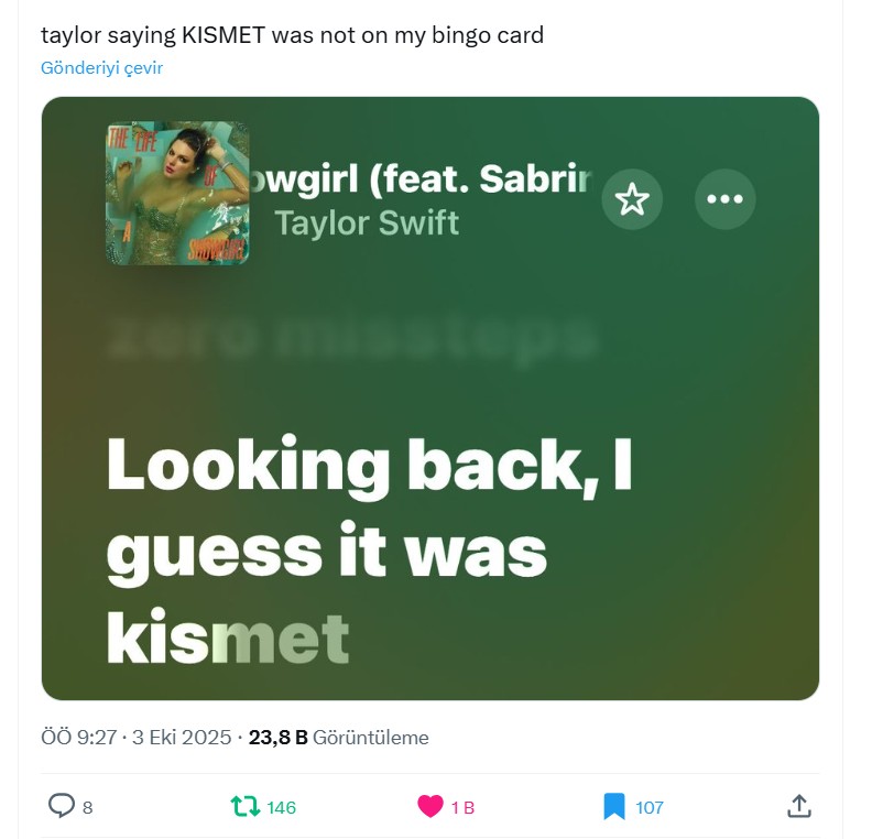 Swift'in yeni albümü sosyal medyada da gündem olurken, Türk hayranlarını şoke eden bir durum yaşandı. Swift'in albümündeki bir şarkıda Türkçe "kısmet" kelimesi geçtiği görüldü.