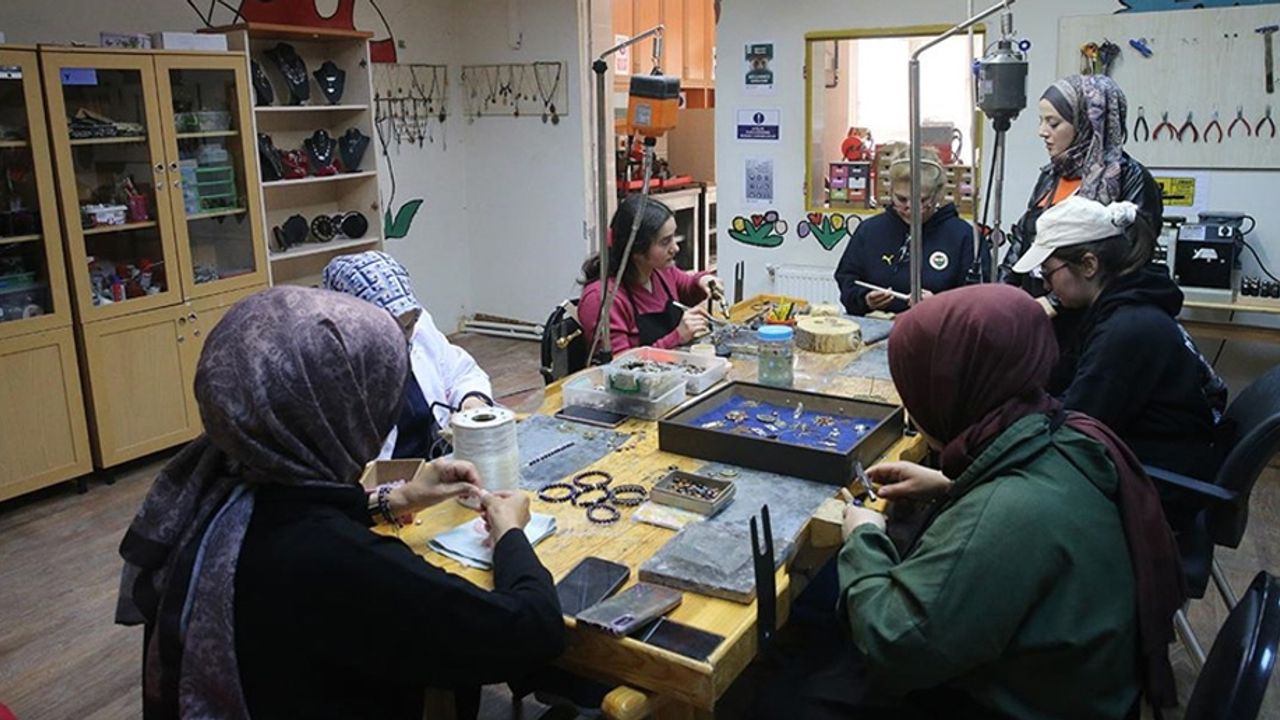 Zile Halk Eğitimi Merkezi'nde açılan kursa katılan 10 kadın, doğada bulunan yarı değerli taşlardan kolye, tespih, yüzük, küpe ve anahtarlık gibi hediyelik eşyalar yapıyor.