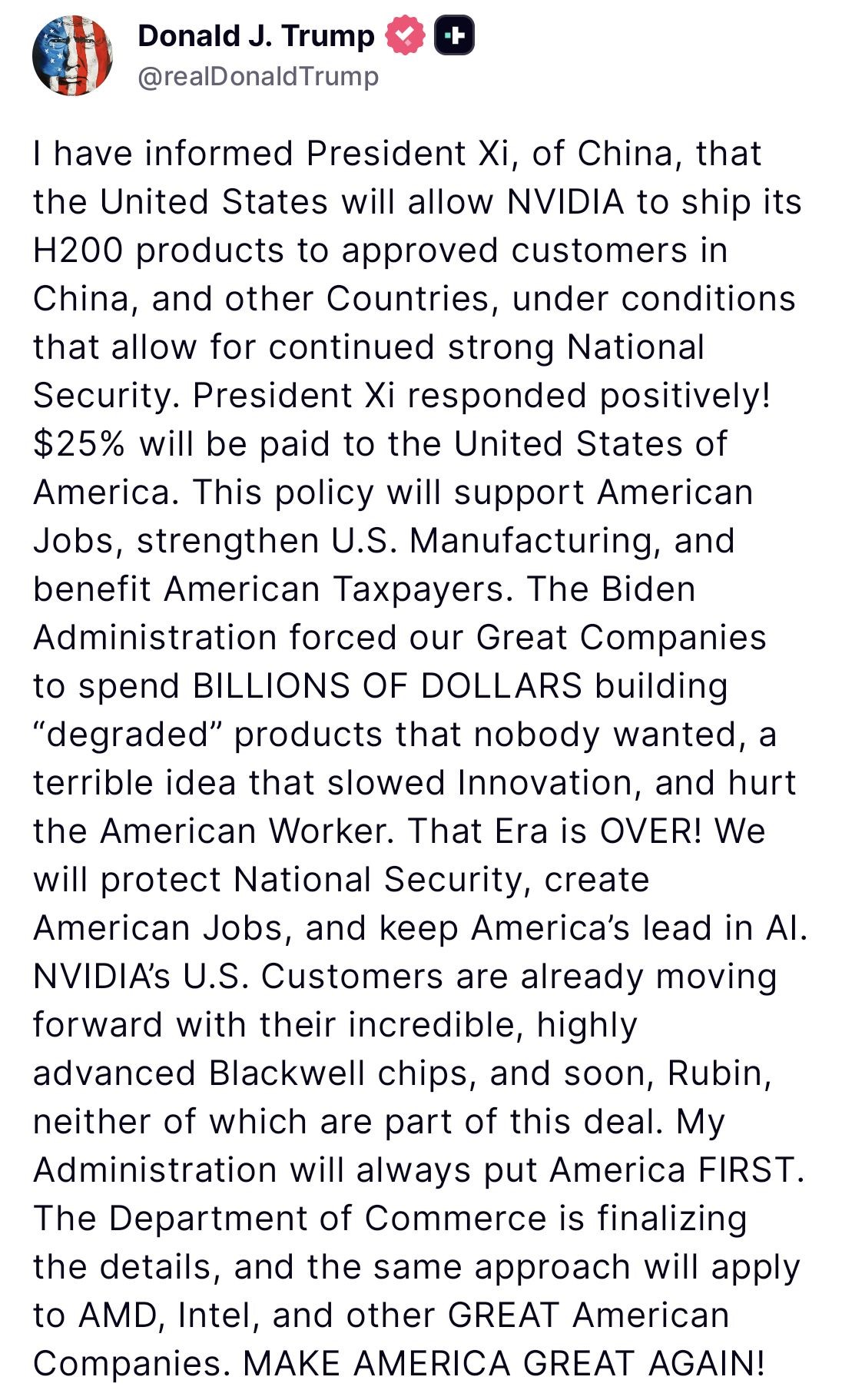 ABD’nin ulusal güvenliğini korumayı sürdüreceklerini vurgulayan Trump, "Amerika’nın iş potansiyelini artıracağız ve Amerika’nın yapay zekâdaki liderliğini sürdüreceğiz. NVIDIA’nın ABD’li müşterileri, anlaşmanın bir parçası olmayan, son derece gelişmiş Blackwell ve yakında gelecek Rubin çipleriyle zaten ilerliyor. Yönetimim her zaman önce Amerika ilkesini gözetir. Ticaret Bakanlığı ayrıntıları netleştiriyor ve aynı yaklaşım AMD, Intel ve diğer büyük Amerikan şirketleri için de geçerli olacak" ifadelerini kullandı.