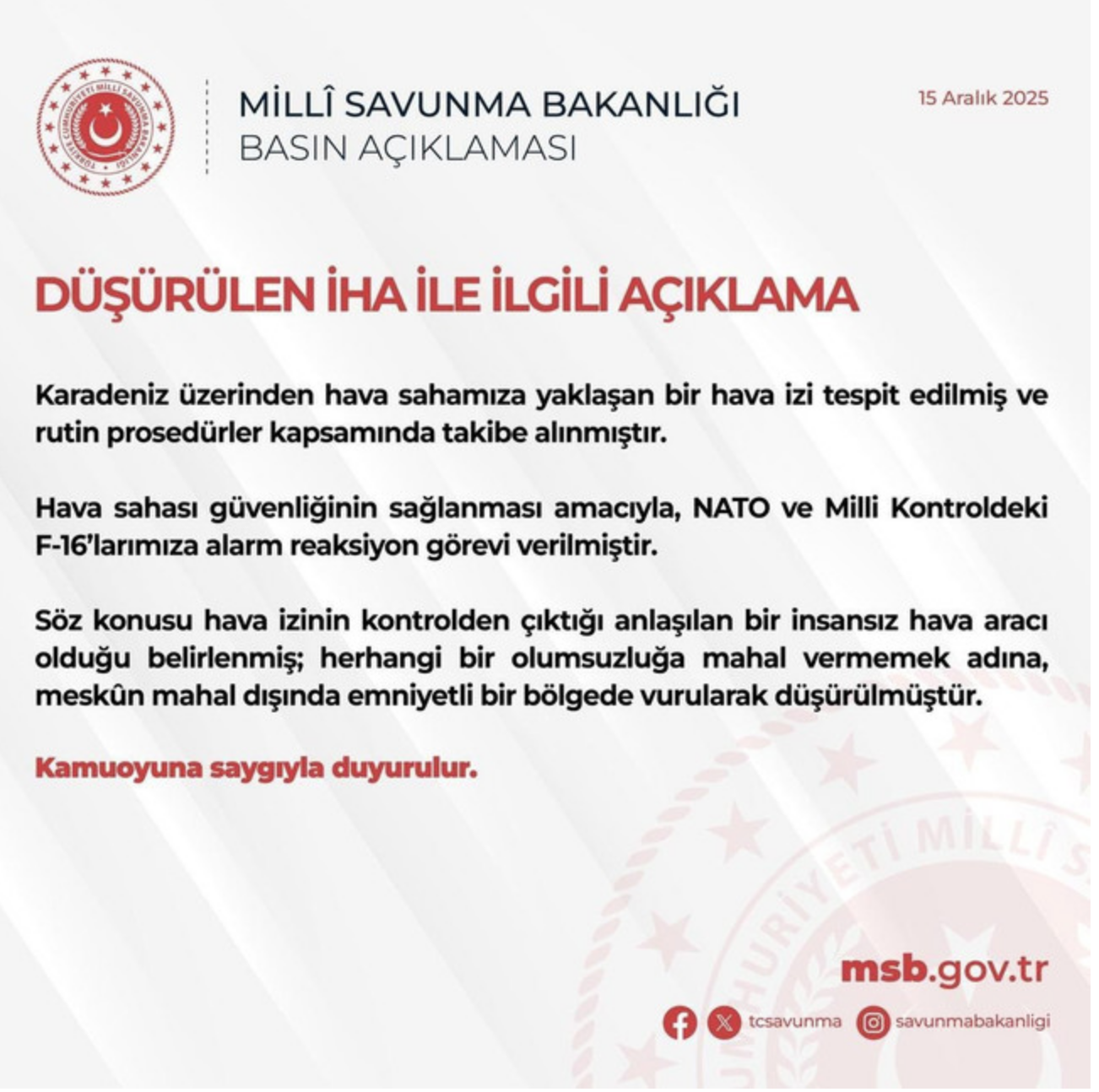 Milli Savunma Bakanlığı tarafından yapılan yazılı açıklamada, "Karadeniz üzerinden hava sahamıza yaklaşan bir hava izi tespit edilmiş ve rutin prosedürler kapsamında takibe alınmıştır. Hava sahası güvenliğinin sağlanması amacıyla NATO ve milli kontroldeki F-16'larımıza alarm reaksiyon görevi verilmiştir. Söz konusu hava izinin kontrolden çıktığı anlaşılan bir insansız hava aracı olduğu belirlenmiş; herhangi bir olumsuzluğa mahal vermemek adına meskûn mahal dışında emniyetli bir bölgede vurularak düşürülmüştür" denildi.