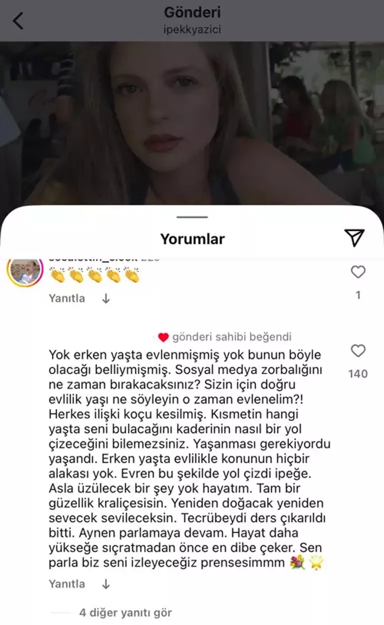 "Yok erken yaşta evlenmişmiş yok bunun böyle olacağı belliymiş. Sosyal medya zorbalığını ne zaman bırakacaksınız? Sizin için doğru evlilik yaşı ne söyleyin o zaman evlenelim! Yaşanması gerekiyordu yaşandı. Yeniden doğacak yeniden sevileceksin. Tecrübeydi ders çıkarıldı bitti."
