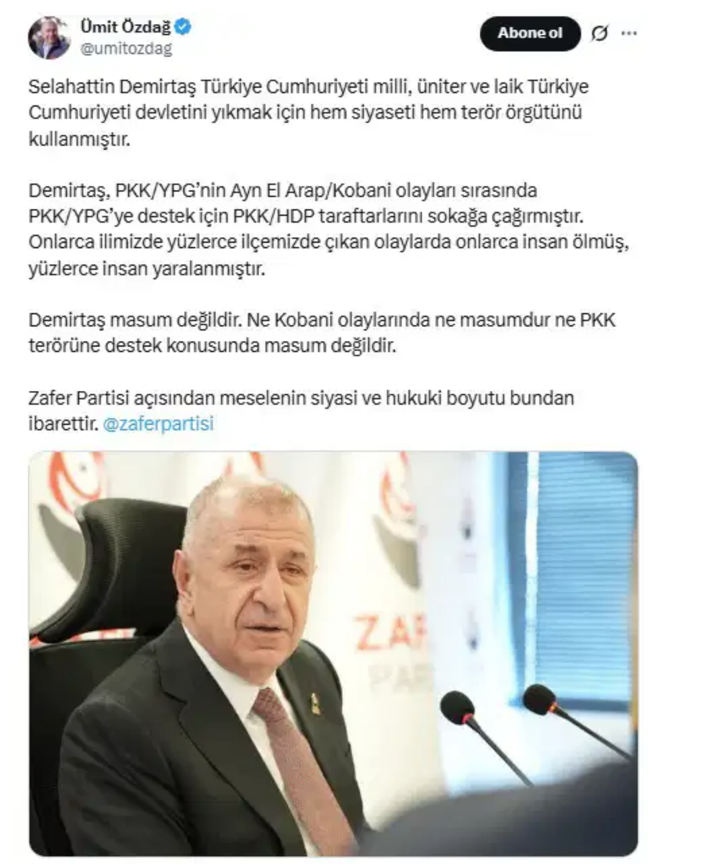 Zafer Partisi Genel Başkanı Ümit Özdağ, MHP lideri Devlet Bahçeli’nin “tahliye edilmesi hayırlı olacaktır” açıklamasının ardından gündeme gelen tutuklu HDP eski Eş Genel Başkanı Selahattin Demirtaş konusunda partisinin duruşunu netleştirdi. Sosyal medya hesabından yaptığı paylaşımda Özdağ, Demirtaş’ın masum olmadığını savunarak, geçmişteki eylemlerinin ve siyasi faaliyetlerinin tartışmalı olduğunu vurguladı.