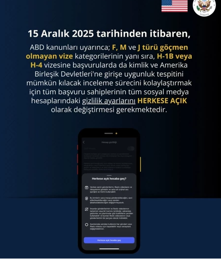 ABD Türkiye Büyükelçiliği, 15 Aralık 2025’ten itibaren F, M, J, H-1B ve H-4 vize başvurularında sosyal medya hesaplarının “herkese açık” olmasını zorunlu kılacağını açıkladı.