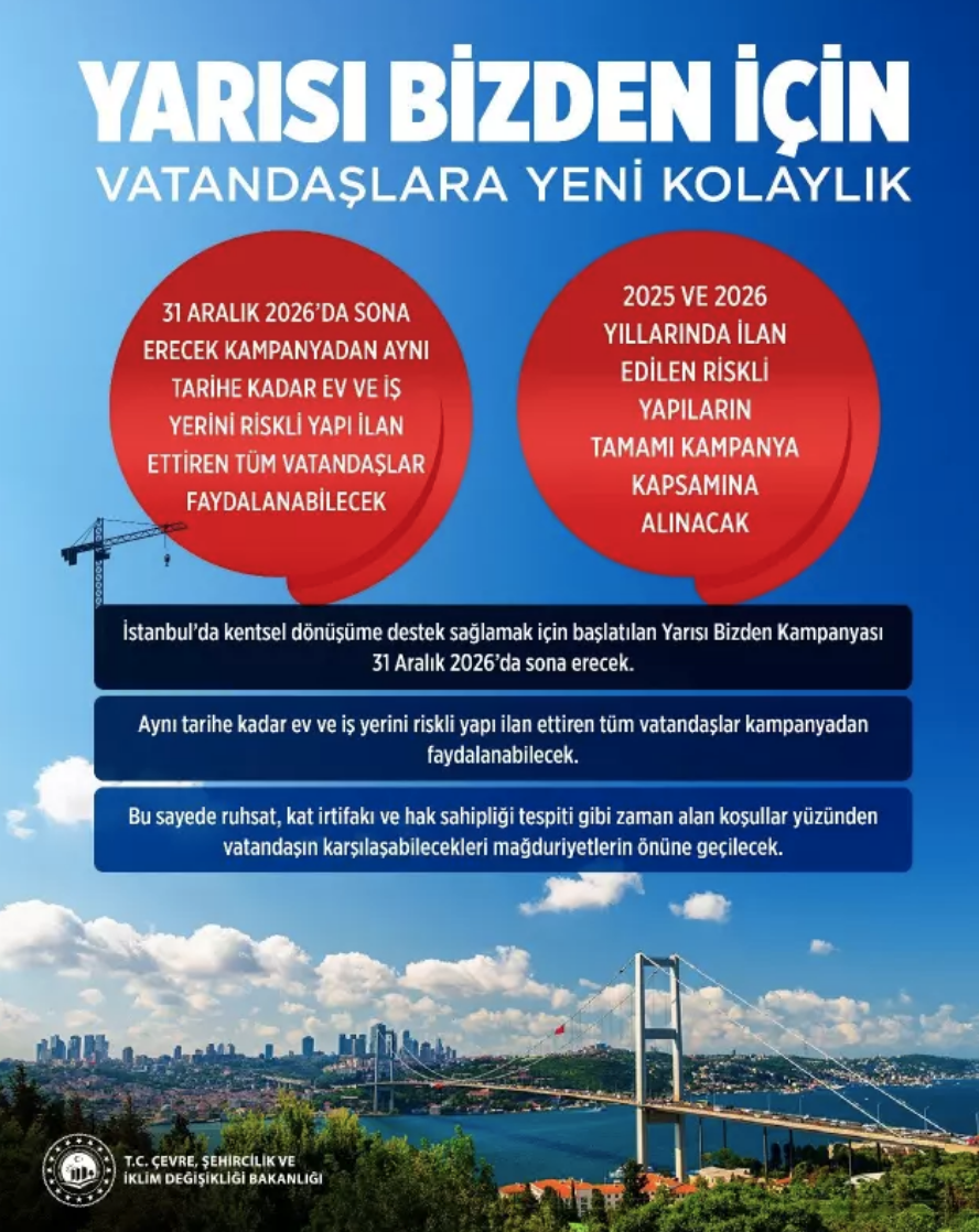 İstanbul'da kentsel dönüşümü hızlandırmak için 22 Şubat 2024'te Cumhurbaşkanı Kararnamesi ile yürürlüğe giren Yarısı Bizden Kampanyası kapsamında vatandaşlara evlerini yeniden inşa ettirmeleri için 875 bin TL hibe, 875 bin TL kredi ve 125 bin TL de tahliye desteği olmak üzere toplam 1 milyon 875 bin TL destek veriliyor. Resmi Gazete'de yayımlanan Cumhurbaşkanı Kararnamesi ile 31 Aralık 2026'da sona erecek kampanya ile ilgili vatandaşların lehine önemli bir düzenleme yapıldı. İlgili kararın 3. maddesinin 13. fıkrasında yer alan "31/12/2026 tarihine kadar" ibaresinden sonra gelmek üzere "6306 Sayılı Kanun kapsamında onaylanan riskli yapılar için" ibaresi eklendi.
